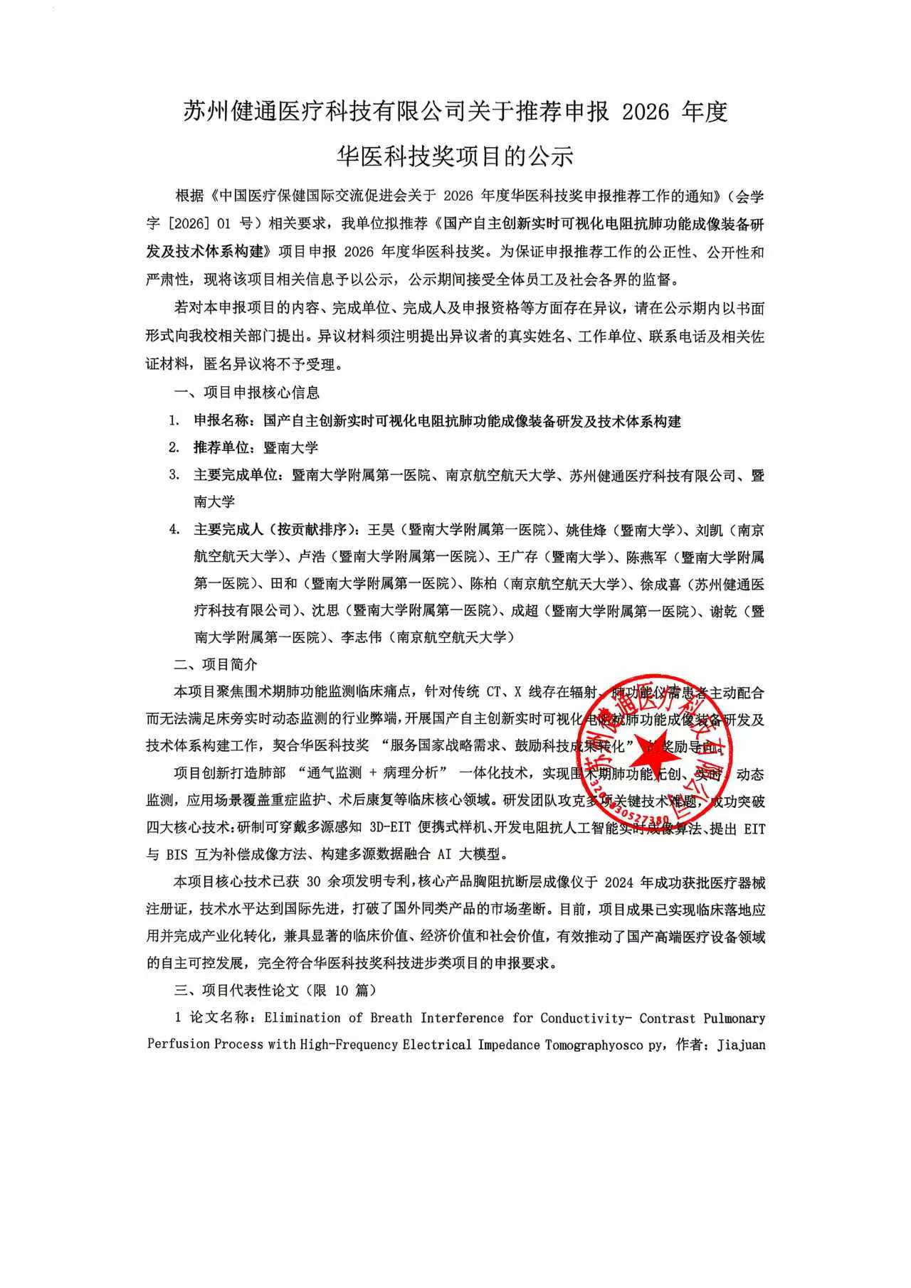 苏州健通医疗科技有限公司关于推荐申报2026年度华医科技奖项目的公示